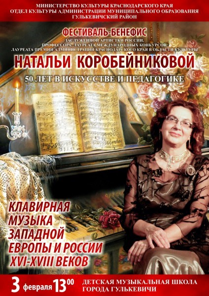 Концерт Заслуженной артистки России, профессора Краснодарского государственного института культуры Натальи Коробейниковой в г. Гулькевичи открывает «Фестиваль-Бенефис» 50 лет в искусстве и педагогике. В течение двух месяцев будет проходить на Кубани этот фестиваль, который стартует в Детской музыкальной школе г. Гулькевичи 3 февраля 2017 г., Наталья Петровна представляет сольную программу «Клавирная музыка Западной Европы и России XVI-XVIII в.в. (рояль).