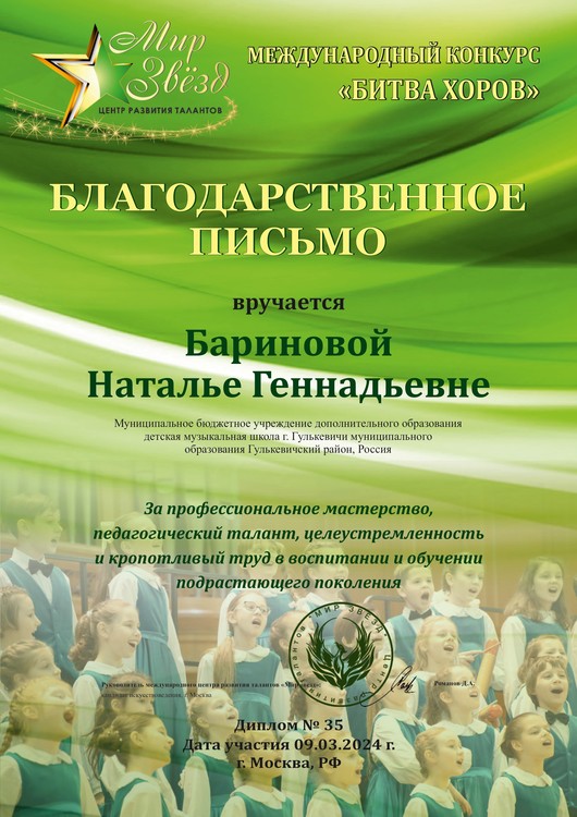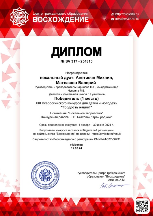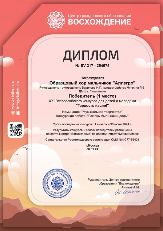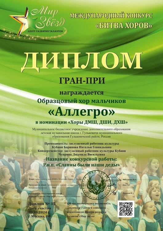 Поздравляем Образцовый хор мальчиков "Аллегро" и вокальный дуэт в составе Аветисяна Михаила и Матлашова Валерия с победой в международных конкурсах "Битва хоров" и "Гордость нации"!